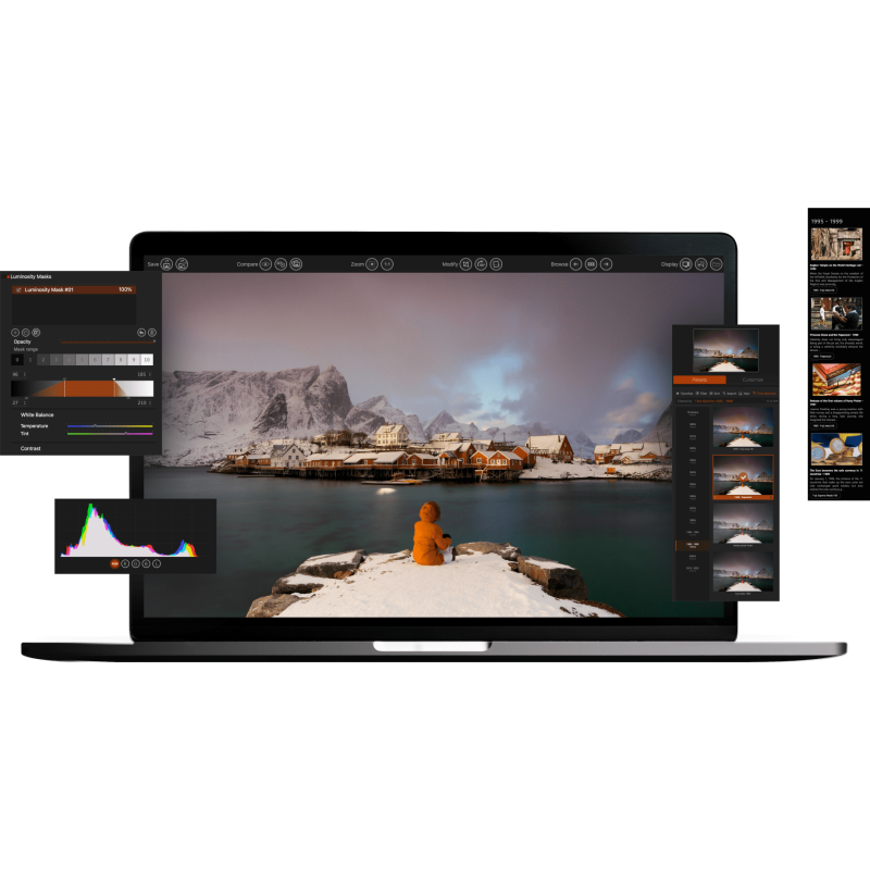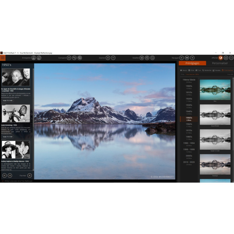 Відкрийте для себе стиль, кольори і зернистість більш ніж 80 легендарних аналогових фільмів завдяки ексклюзивному процесу калібрування DxO. Комбінуйте безліч оригінальних візуалізацій з фільтрами, віньєтуванням, розмиттям, текстурою, рамкою або ефектами витоку світла, щоб надати вашим фотографіям унікального вигляду.